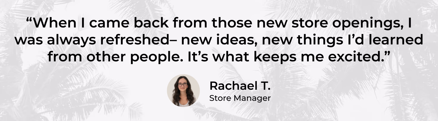 Rachael: I expected a positive place to work, but I thought it would be like other retail jobs I had. You show up, you do your best, and you hope someone notices. I didn’t expect leaders to be as invested as they were or to take the time to help me figure out what I was good at and where I could go.