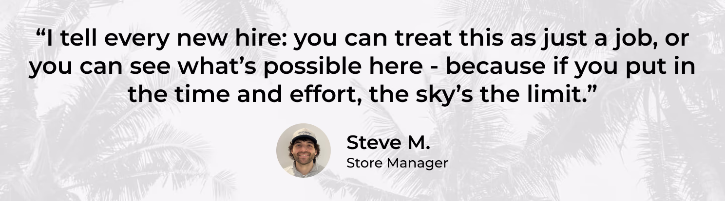 Steve: I thought it would be a steady retail job where I could work with people and help customers. That part turned out to be true, but it became clear pretty quickly that the team here is different. People care about the work, and they care about helping each other grow. I didn’t expect that level of support.